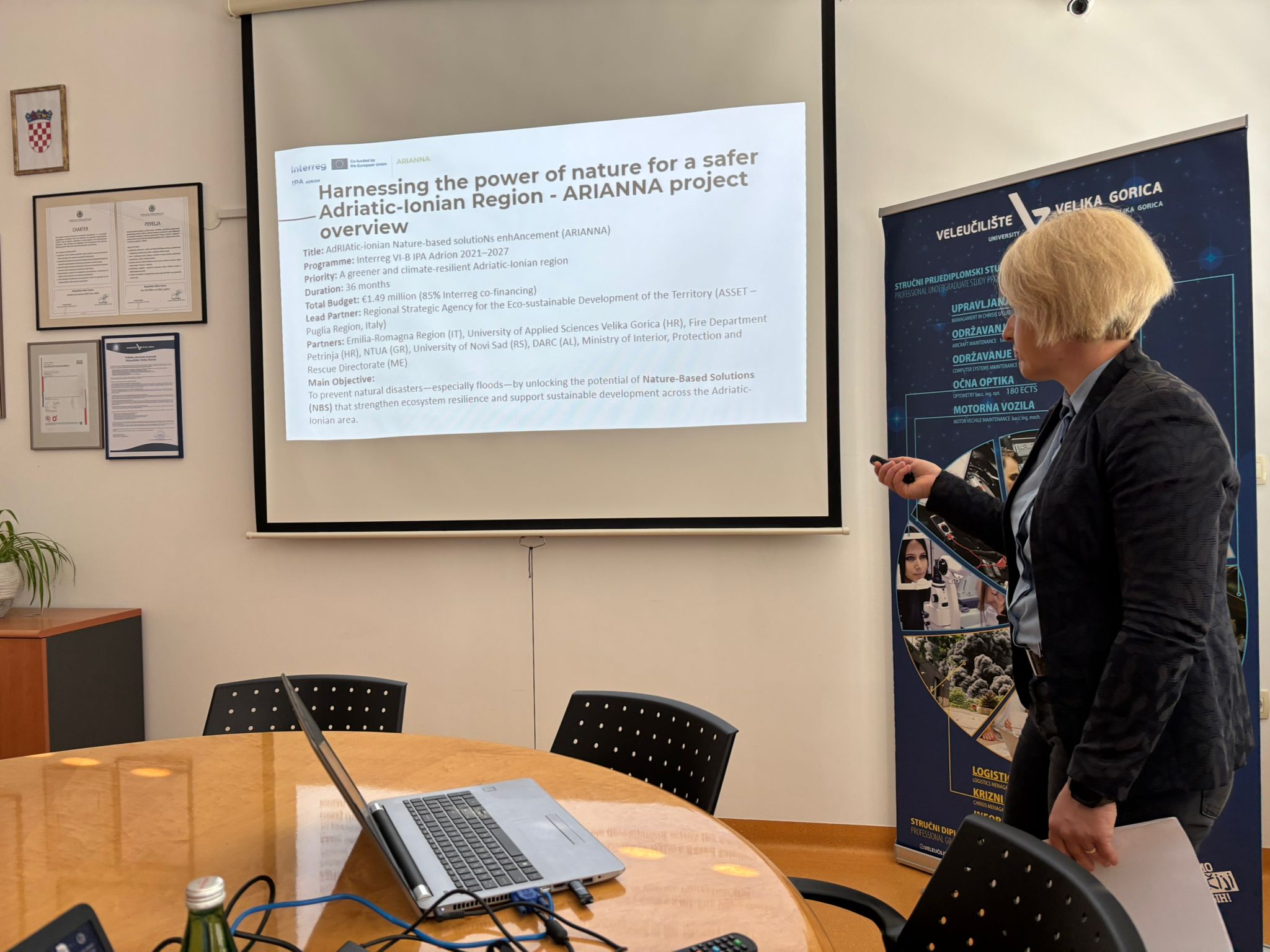 Podsjećamo, Veleučilište Velika Gorica sudjeluje kao projektni partner u projektu „AdRIAtic-ionian Nature based solutioNs enhAncement (ARIANNA)“ financiranom iz programa Interreg IPA Adrion. Koordinator projekta je ASSET – Agenzia regionale Strategica per lo Sviluppo Ecosostenibile del Territorio iz Italije, a, osim Veleučilišta, na provedbi projekta sudjeluje još 6 partnera. Projekt je službeno započeo 01.09.2024. godine, a traje do 31.08.2027. godine, s ukupnim proračunom od gotovo 1,5 milijuna eura. Cilj projekta je doprinijeti sprječavanju rizika od prirodnih katastrofa, posebno od poplava, koje sve više utječu na ekološke sustave. Ključne aktivnosti Veleučilišta su: sudjelovanje u razvoju strategije koja ima za cilj povećati otpornost jadransko-jonske regije na klimatske promjene i prirodne katastrofe; jačanje kompetencija dionika za odgovor na rizike od poplava i povećanje svijesti zajednice o otpornosti na klimatske promjene; sudjelovanje u implementaciji pilot akcija; te razmjena znanja i iskustva među projektnim dionicima.