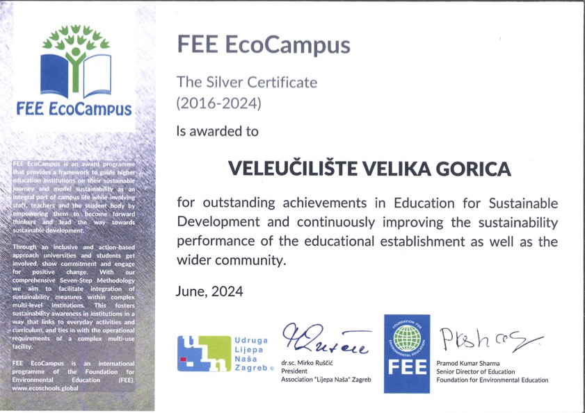 Veleučilište Velika Gorica priključilo se 2016. godine FEE EcoCampus programu koji promiče ekološka rješenja, održivost i zaštitu okoliša.